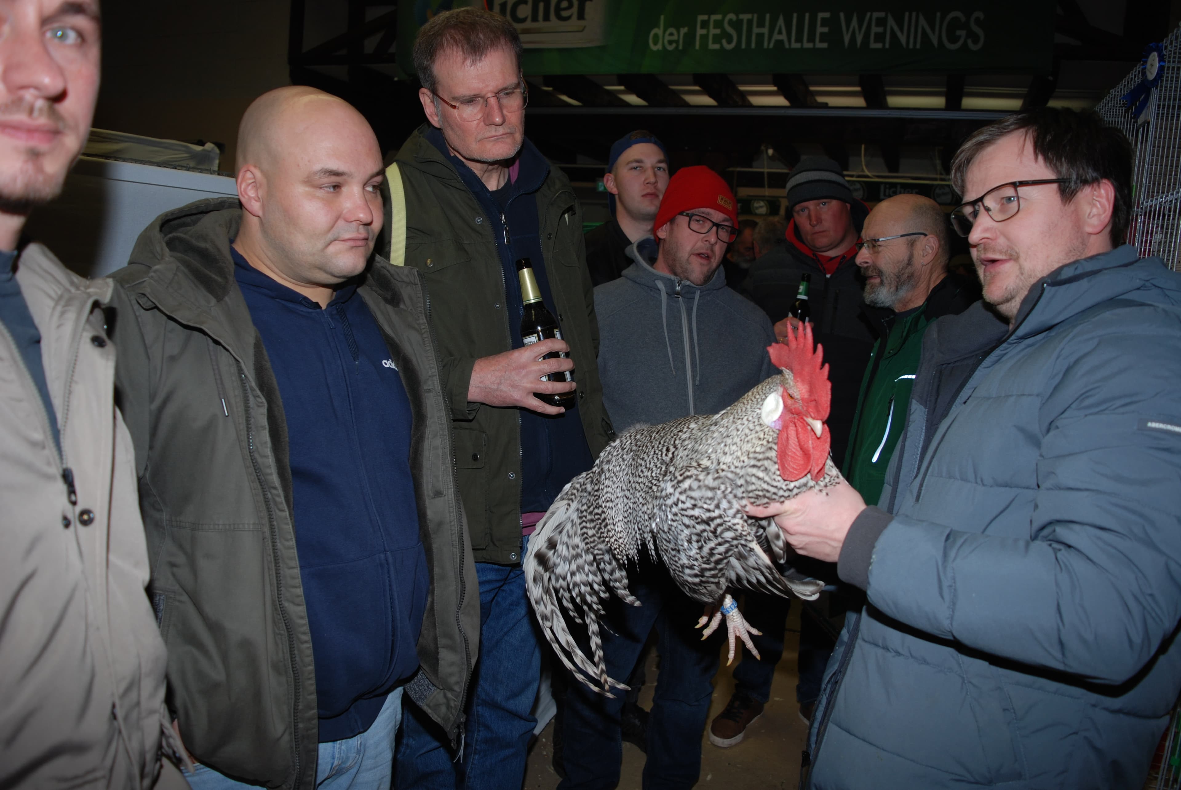 Bei den Hennen freute er sich über viele großrahmige Tiere mit guten Gewichten. Form und Brusttiefe hätten sich deutlich verbessert. Bei einigen Tieren bemängelte er die Lauffarbe, die fleischfarben sein soll. Auch die Vorkämme sollten straffer sein, gab er den Züchtern mit auf den Weg.