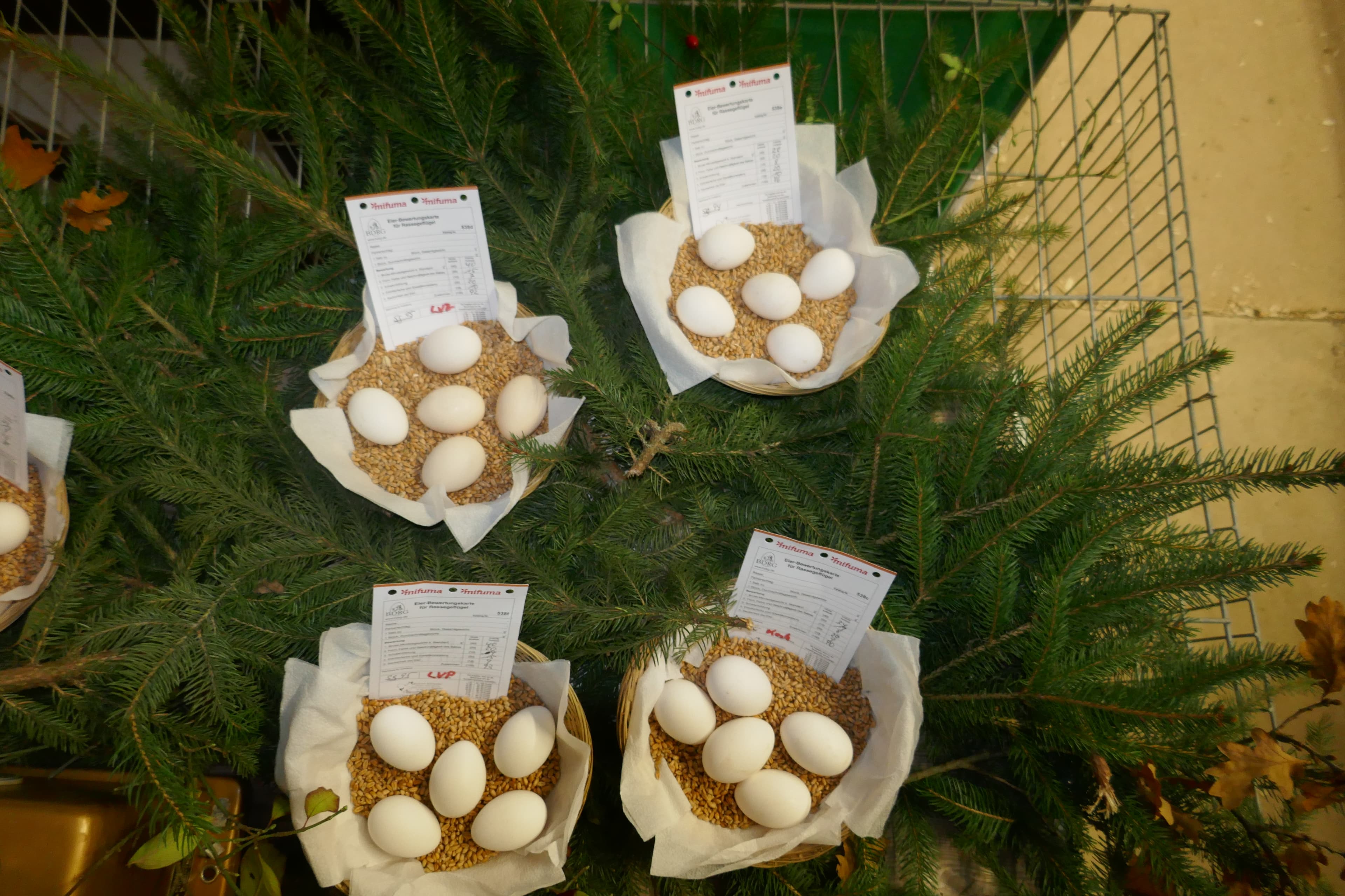 Erstmals fand auch eine Eierausstellung statt. Fünf Züchter präsentierten jeweils sechs Eier ihrer Deutschen Sperber. Christopher Korr assistierte dem Preisrichter Michael Schneider. Bewertet wurden Form, Farbe, Schalenbeschaffenheit und Gewicht der Eier. Für die Form gabs gute Noten, alle Eier wiesen keine Wellen im Profil auf. Kritik dagegen bei der Farbe: Drei Eier-Sets waren cremefarbig, im Gegensatz zum Standard in reinweiß. Einschränkungen gabs auch beim Gewicht: Viele Eier der Junghennen erreichten nicht den Standard von 60 Gramm. Jeweils ein Ei wurde aufgeschlagen. Auf dem Teller mussten drei Phasen zu erkennen sein: Eigelb, festes Eiklar direkt am Eigelb, flüssiges Eiklar außen. Alle Eiersets wurden mit sehr gut bewertet. Der Hauptpreis, ein Honigkorb, ging an Sepp Braun aus Nidda.