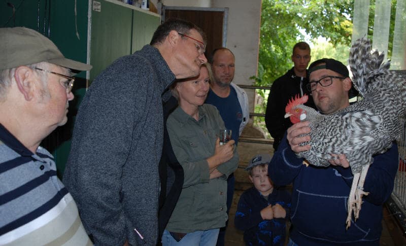 Nach dem gemeinsamen Mittagsessen fand eine Tierbesprechung statt. Zuchtwart Maik Helmbold erläuterte Vorzüge und Wünsche bei jungen Hähnen und einjährigen Hennen. Er verwies auf die Zuchtziele und motivierte alle Züchter, auch bei Rückschlägen durch Krankheiten oder Raubtiere weiter zu machen. Mit einem Grillabend und der Verkostung von selbst hergestelltem Eierlikör klang die Sommertagung am Samstagabend aus.